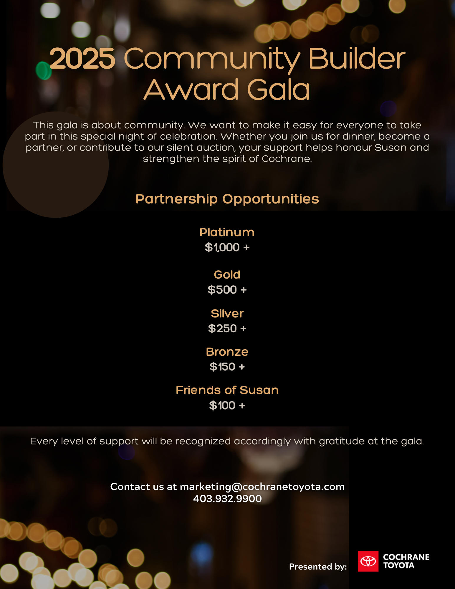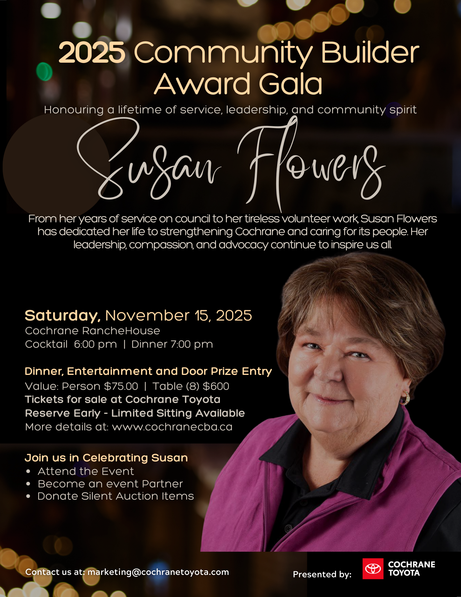 Silent auction donations can be dropped off at Cochrane Toyota, ask for Mili or Nicola.