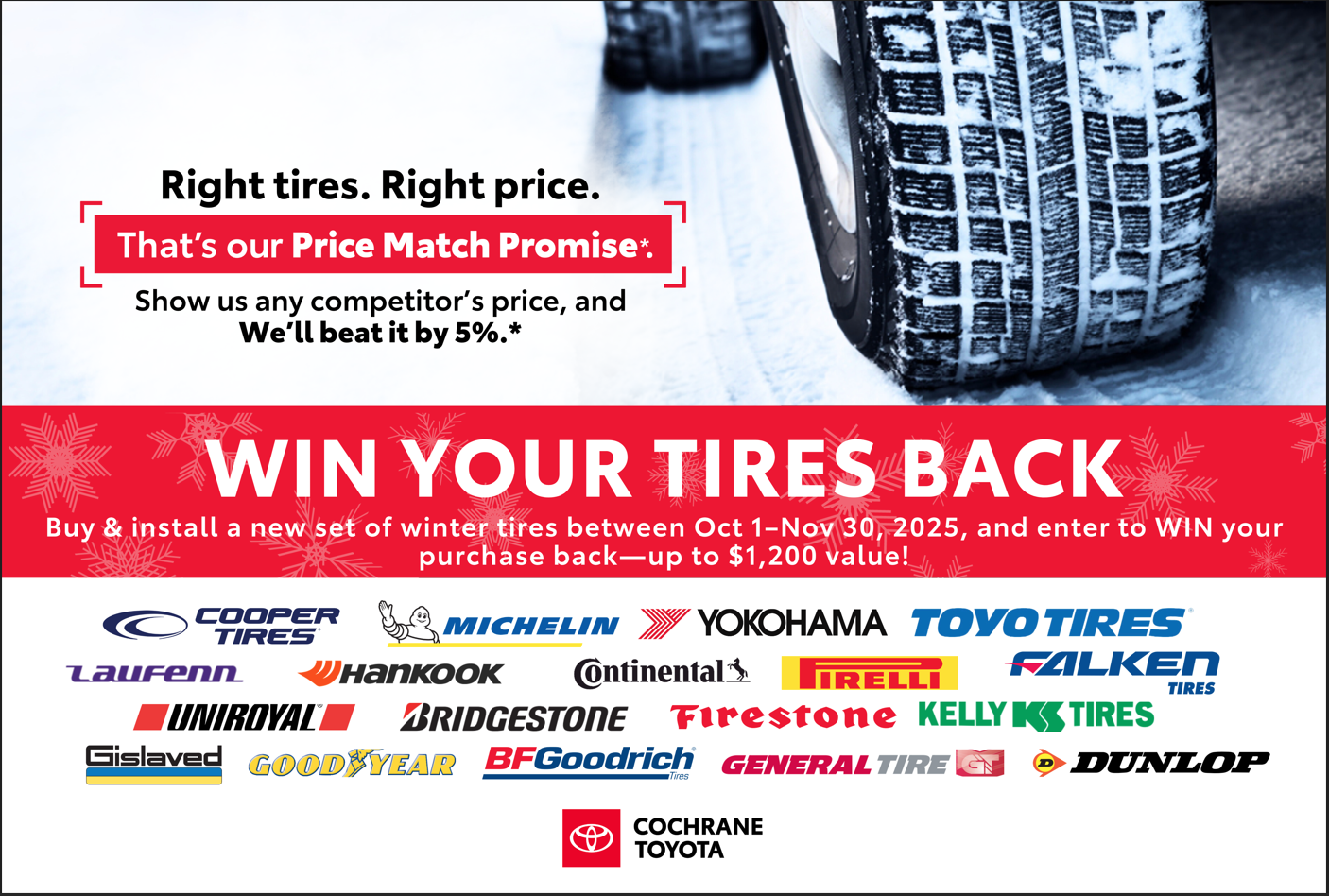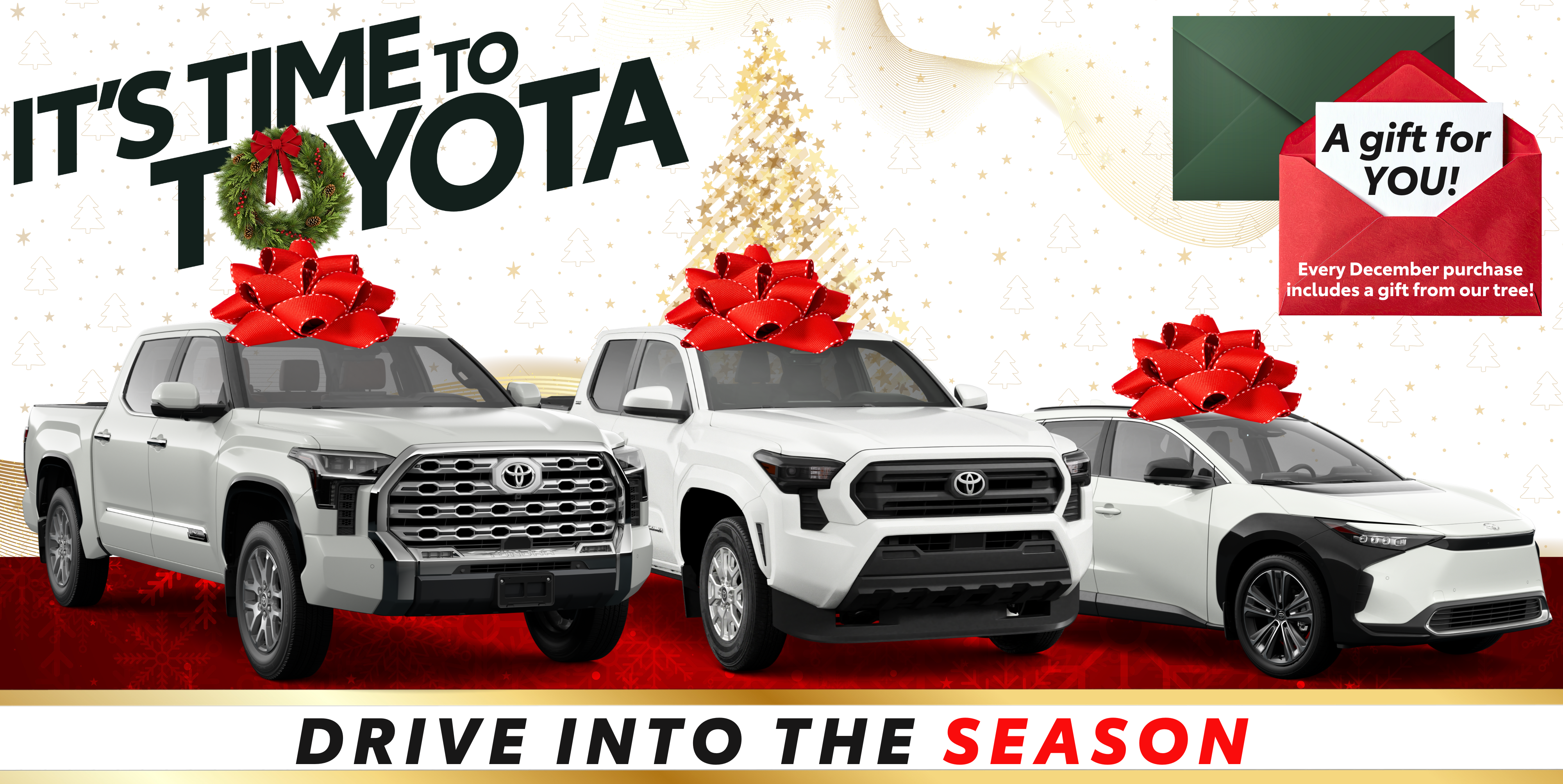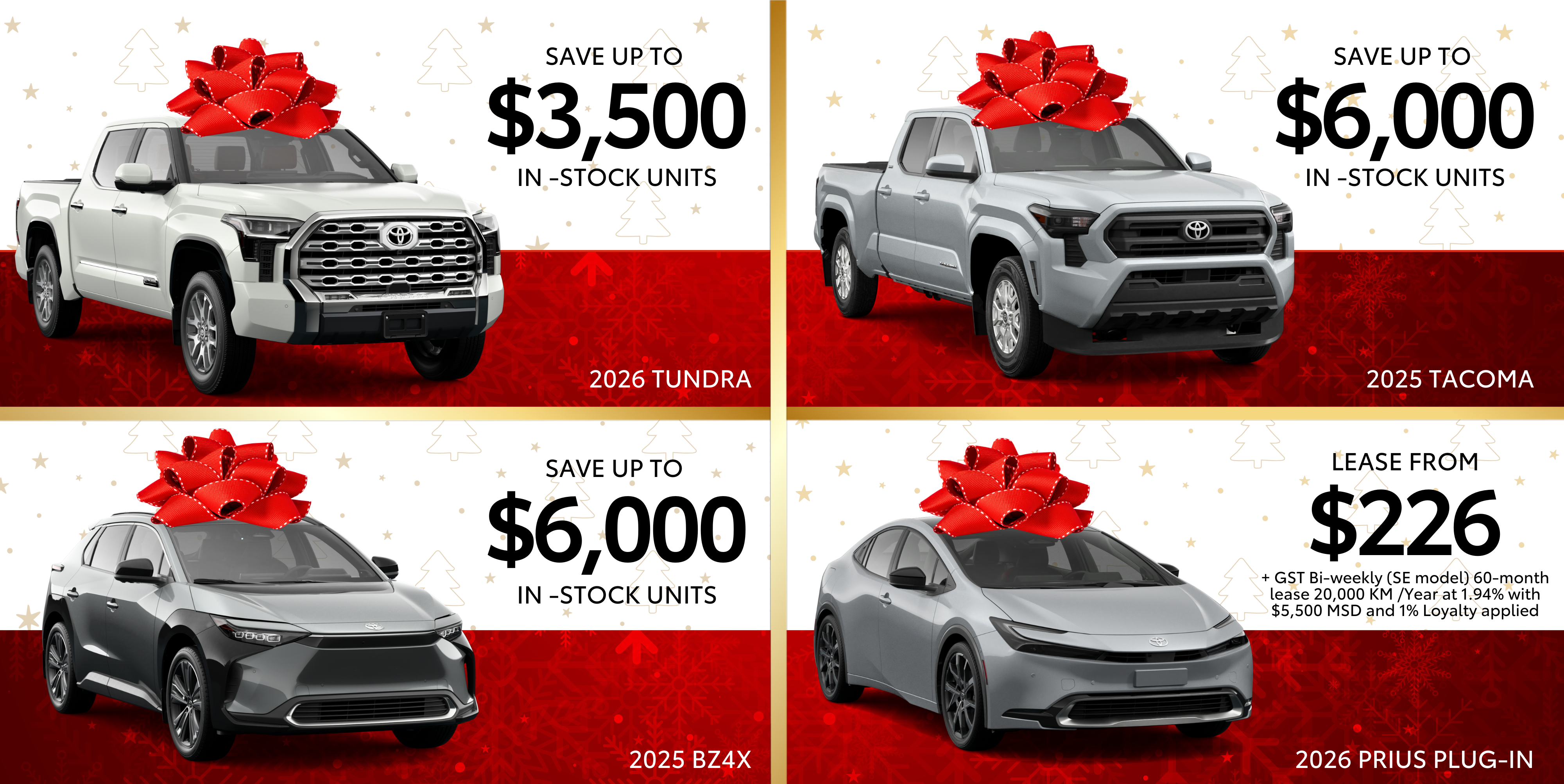 Celebrate the season with big savings across our in-stock lineup! Get up to $3,500 off the 2026 Tundra, up to $6,000 off the 2025 Tacoma, and up to $6,000 off the 2025 bZ4X. Plus, lease the 2026 Prius Plug-In from just $226 bi-weekly (SE model, 60-month lease, 20,000 km/year at 1.94% with $5,500 MSD and 1% Loyalty applied; GST extra). All offers apply to in-stock units only and are available this December at Cochrane Toyota.